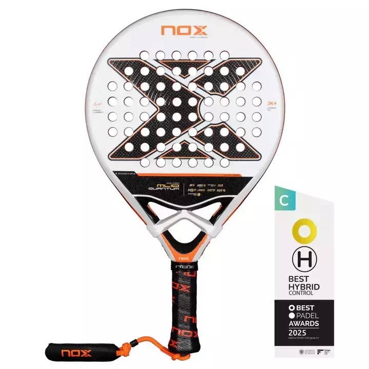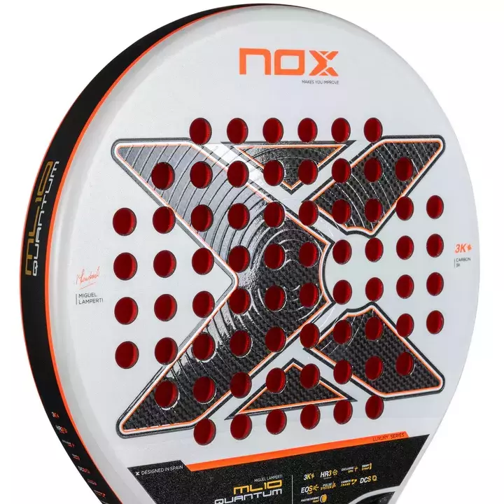 La nueva ML10 Quantum 3K conserva la icónica combinación de materiales de sus predecesoras: fibra de carbono 3K y la clásica goma HR3 de NOX, la preferida de Miguel Lamperti, con la incorporación del cambio de color Eva. Una pala “plug and play” de fácil adaptación, con un tacto intermedio característico de las palas NOX. Incorpora la tecnología EXCLUSIVE SPIN, con doble acabado rugoso: 3D hexagonal en el centro y textura de arena en el resto. Esta combinación mejora el control y permite añadir más efecto a la bola.